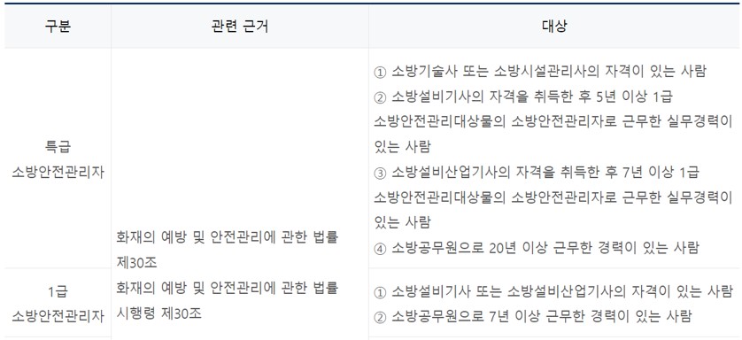 - 소방설비기사 및 소방안전관리자 자격증(위험물 운송자, 위험물 안전관리자, 기간한정 소방안전관리자, 3~1급 소방안전관리자, 특급 소방안전관리자)에 대한 시험 일정과 자격증 취득 방법을 안내합니다. 각 자격증의 최신 소식을 확인하고, 자격증 신청 및 자격 취득확인(자격 발급 진위확인)도 할 수 있습니다.