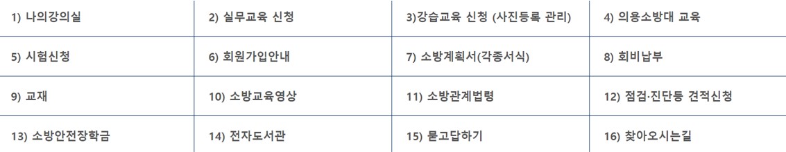 지금까지 소개드린 서비스 외에도 회원가입안내, 회비납부, 묻고 답하기, 소방안전장학금 등 다양한 정보가 있습니다.