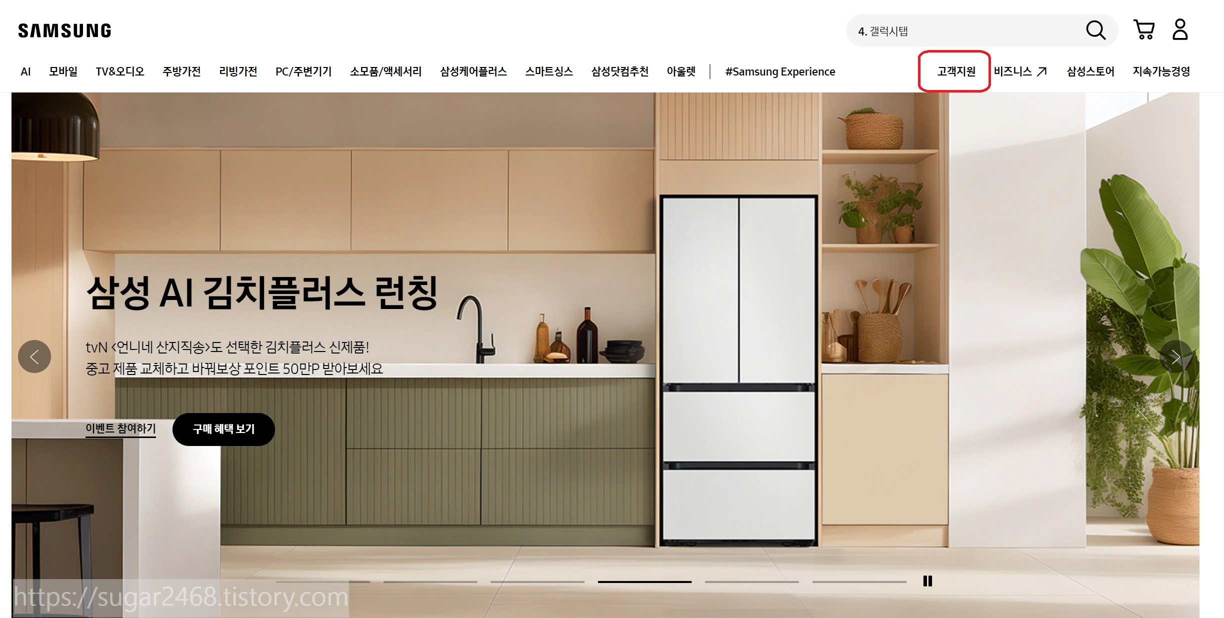 - 삼성전 홈페이지에 접속한 후, 메뉴에서 '삼성스토어' 항목을 클릭합니다.