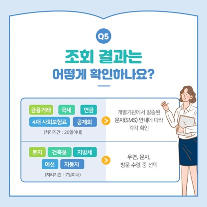 상속인(또는 후견인)이 금융거래내역, 토지, 자동차, 세금, 연금가입유무 등 사망자(또는 피후견인)의 재산내역을 한 번에 통합 조회하는 서비스입니다.