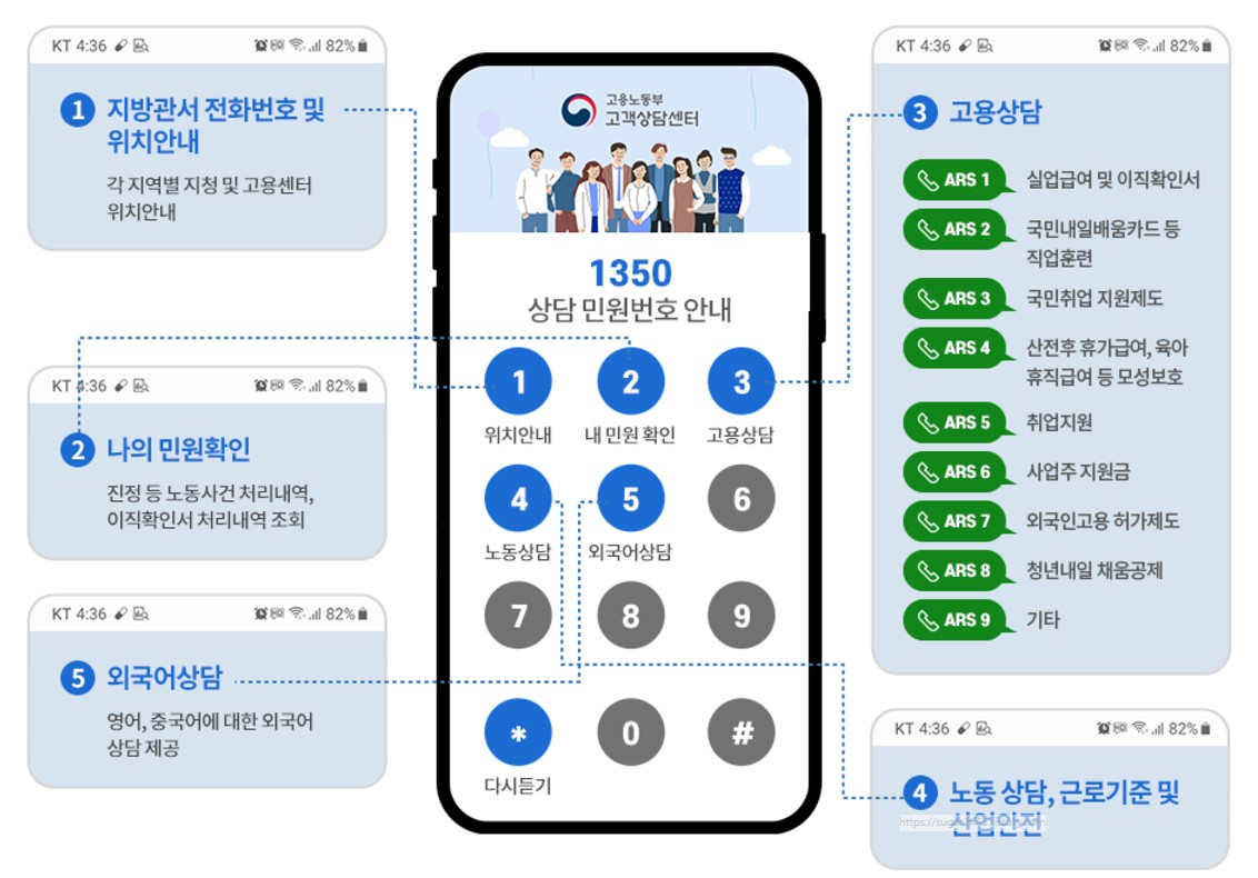 - 1번-위치안내, 2번-내 민원확인, 3번-고용상담, 4번-노동상담, 5번-외국어상담입니다.