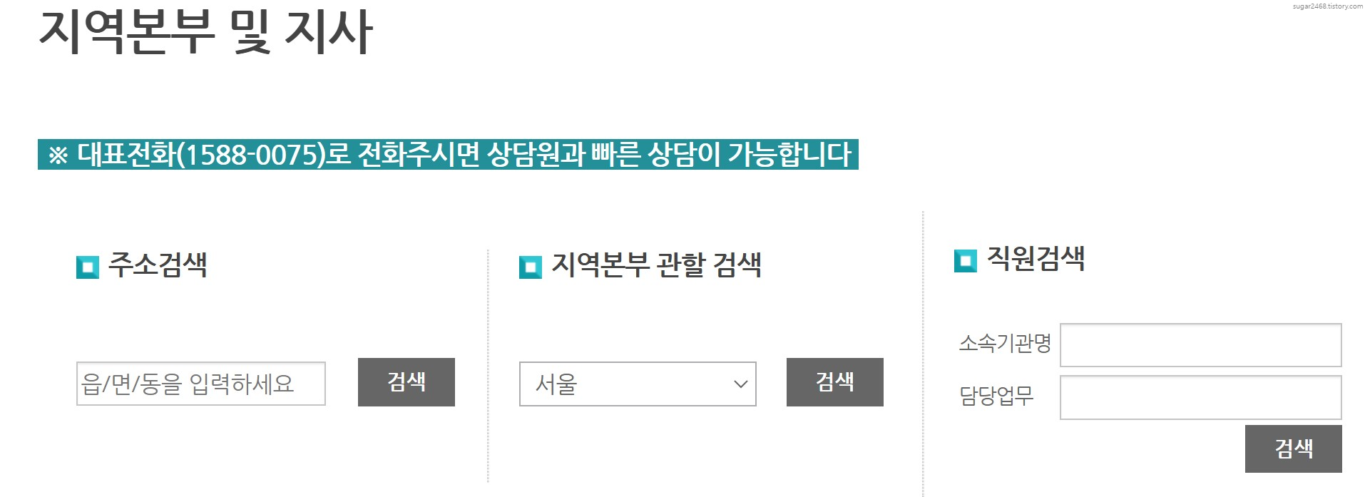 3. 주소검색, 지역본부관할검색 또는 직원검색으로 지역본부와 지사검색을 이용할 수 있습니다.