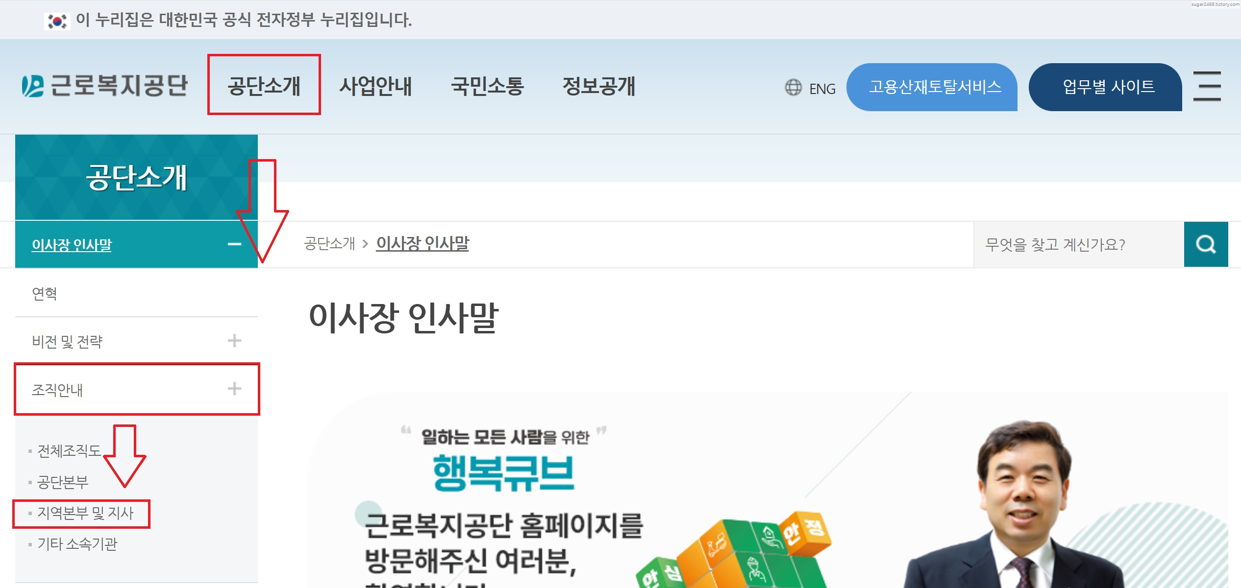 2. 근로복지공단 홈페이지 메뉴 중 공단소개 조직안내> 지역본부 및 지사로 접속합니다.
