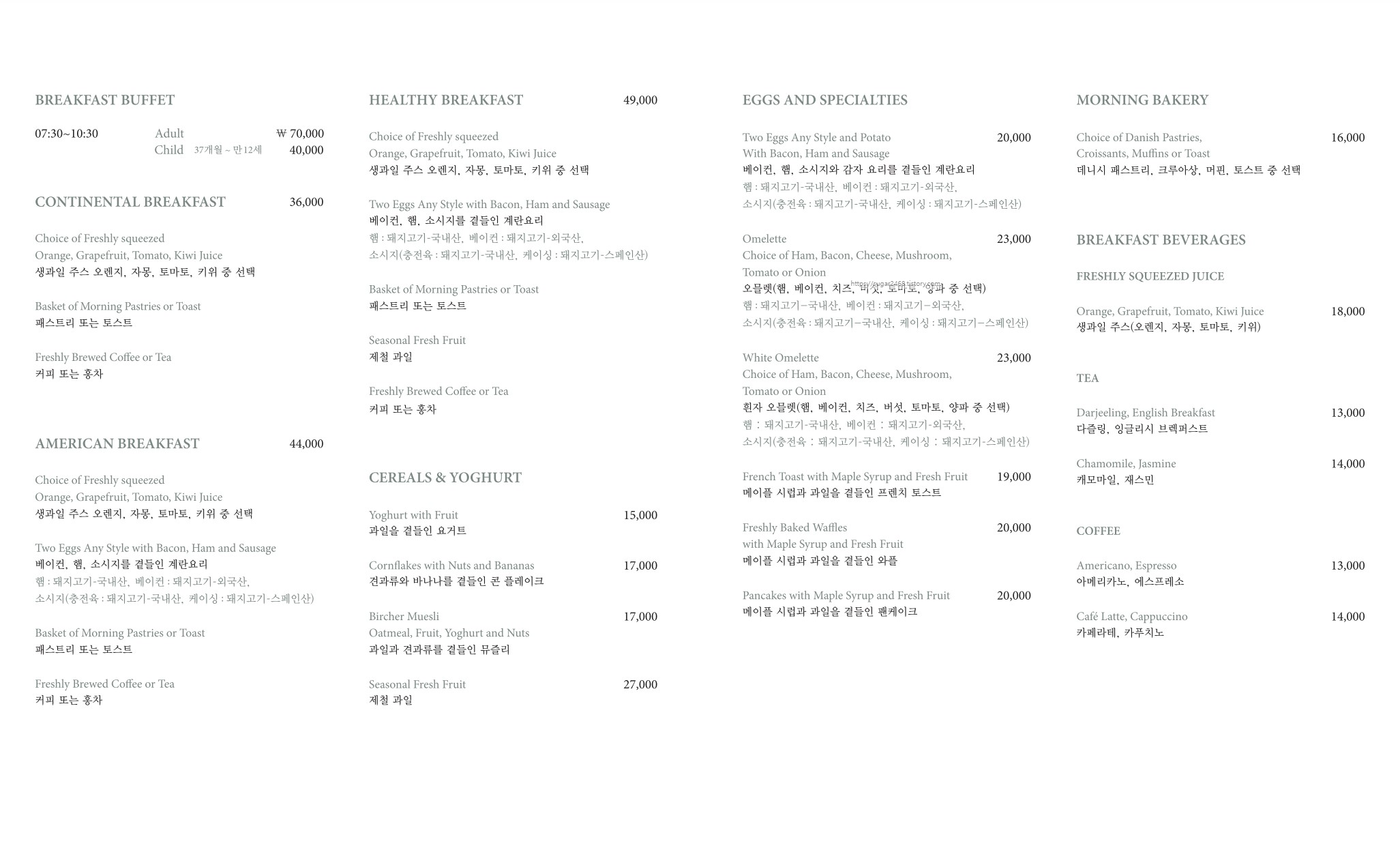 | 아침 뷔페 | 07:30 ~ 10:30 | 성인 70,000원 어린이 40,000원 |