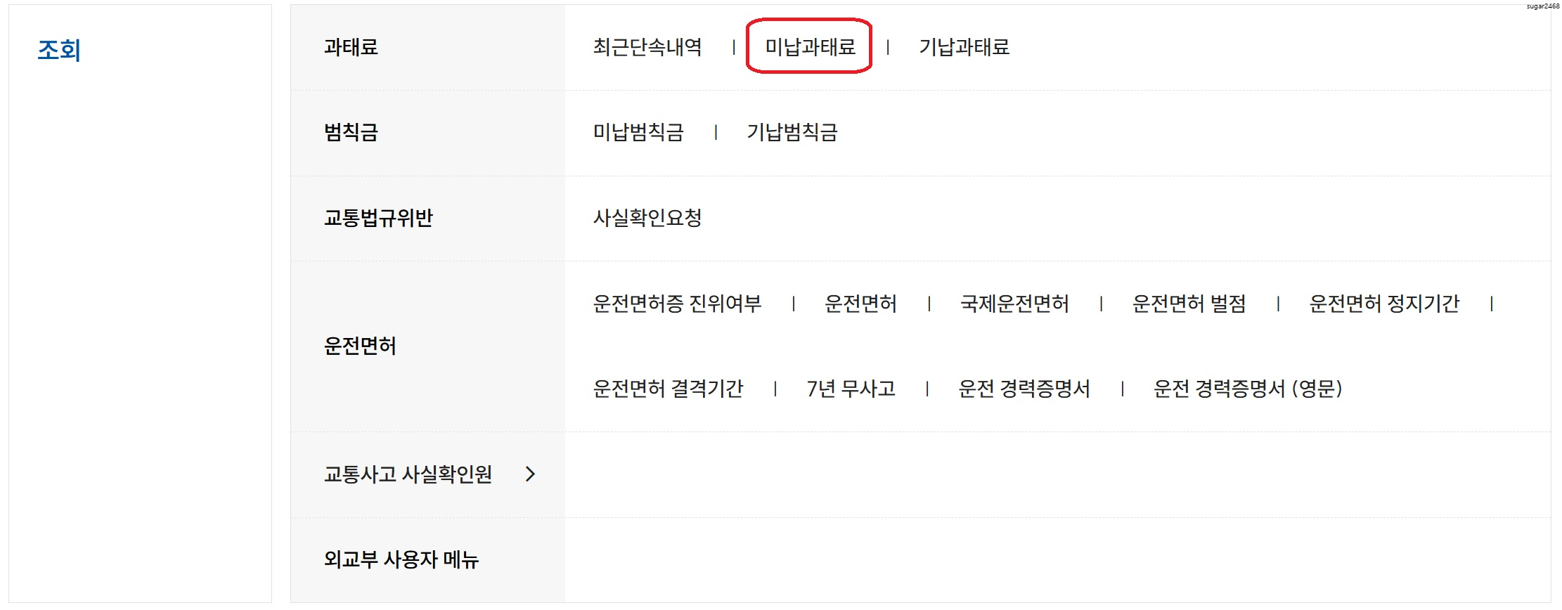 조회 메뉴에서 미납과태료를 선택합니다.
